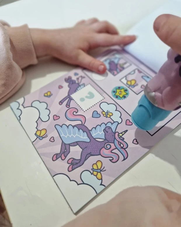 - Use the cute, collectible character to stamp fantasy-themed stickers on the 24-page Unicorn activity pad and on other creative art projects