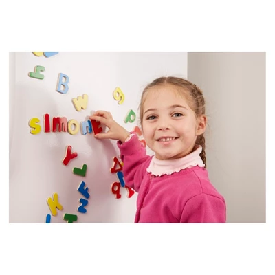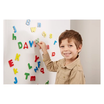 Easy to position and reposition on any magnetic surface, these shaped wooden magnets are a playful way to introduce letters and numbers! A terrific tool for hands-on exploration of these key early learning concepts–the building blocks for writing and math skills–this brightly colored collection naturally encourages sorting, matching, fine motor skills, and hand-eye coordination, too. Each set (Letters and Numbers) is housed in a sturdy wooden case with a see-through, slide-shut lid.
