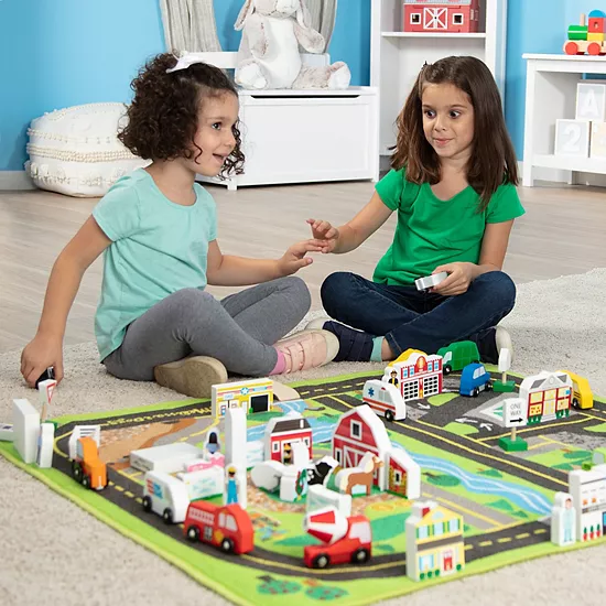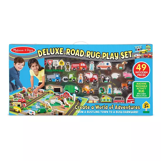 Create a world of adventures, from a bustling town to a busy barnyard! This deluxe play set includes a soft and durable machine-washable activity rug, and 49 wooden play pieces to bring it to life.
