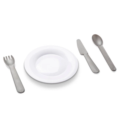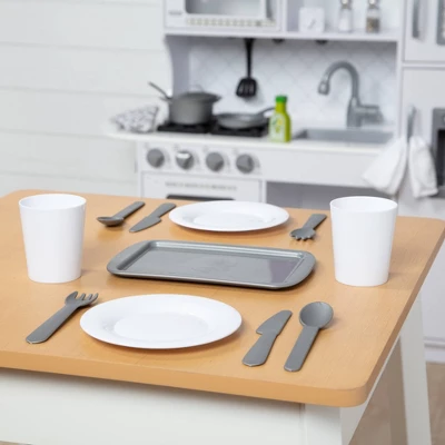 - Includes durable plastic pot, pan, cookie sheet, spatula, serving spoon, place settings for two, and a timer