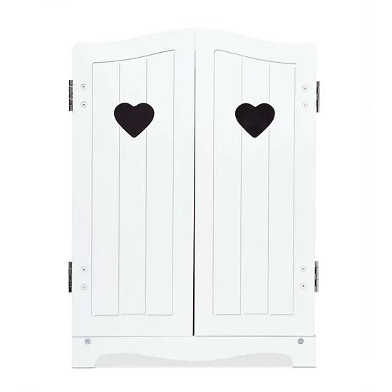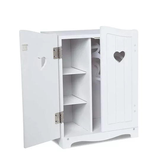 Help favorite dolls and stuffed animals get organized with this realistic and modernly styled wooden armoire that suits any décor! There are three shelves for folded doll clothes and a rod with three hangers for dresses and jackets (clothing not included).