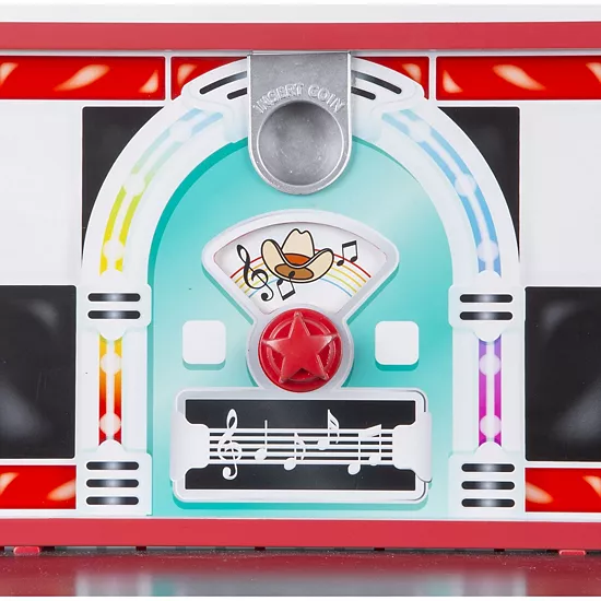 - Booth side includes jukebox with spinning dial and coin to drop in slot; spinning cake plate on pass-through shelf