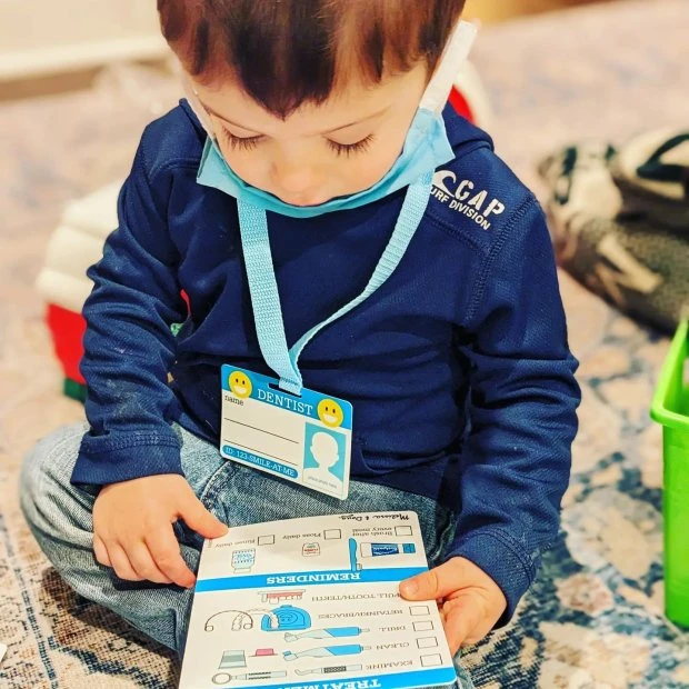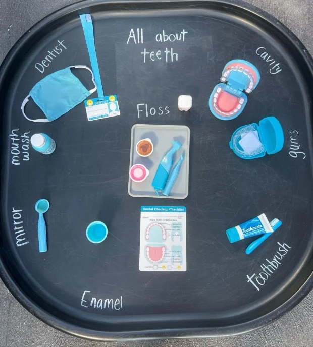 - Includes set of pretend teeth, “cavity” stickers, examination tools, toothbrush, toothpaste tube, dental rinse bottle and cup, 2 gauze pads, 2 tooth polish cups, top and bottom retainers and braces, mask, reusable ID tag on a lanyard, double-sided reusable activity card