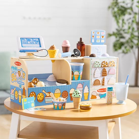 - Order, create, and serve cool pretend play frozen treats with this sturdy wooden ice cream shop counter featuring a soft serve dispenser, magnetic write-on ordering and payment tablet, magnetic menu board, display area, and lots of storage